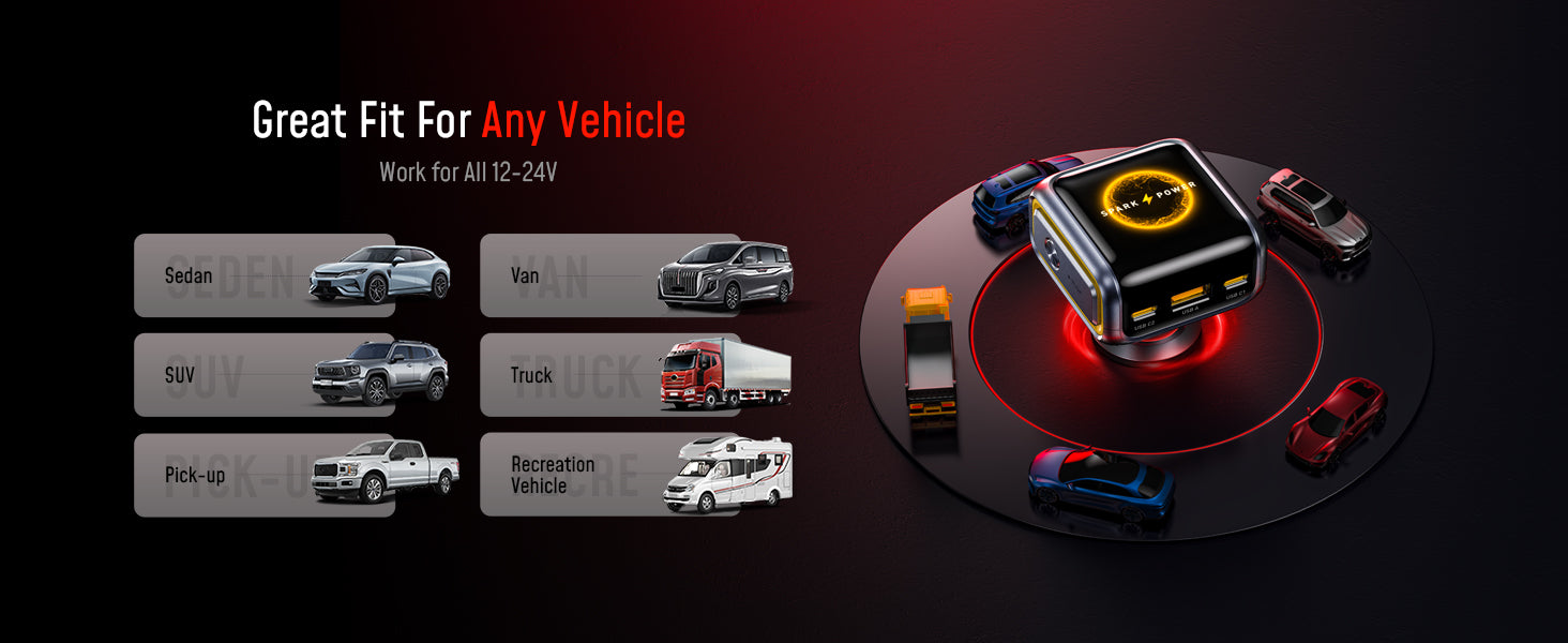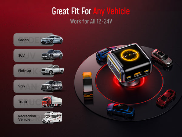 Universally Compatible for Over 1,000 Devices:Works with MacBook, HP, Dell, Microsoft, iPad, iPhone 17 and earlier, Pixel, Galaxy, and more. Compatible with all 12–24V vehicles—Sedans, SUVs, Pickups, Vans, Trucks, and Recreation Vehicles—truly one charger is all you need for every device, wherever you go.