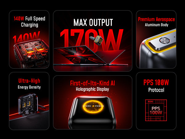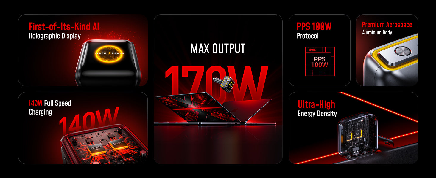 New PD 3.1 140W & PPS 100W Fast Charging: AOHI 170W car charger delivers up to 140W full-speed charging for high-power laptops like MacBook Pro 16" (0–56% in 30 min). It also supports PPS 100W fast charging for tablets and smartphones, e.g., Galaxy S24 Ultra 0–50% in just 19 min with Super Fast Charging 2.0.