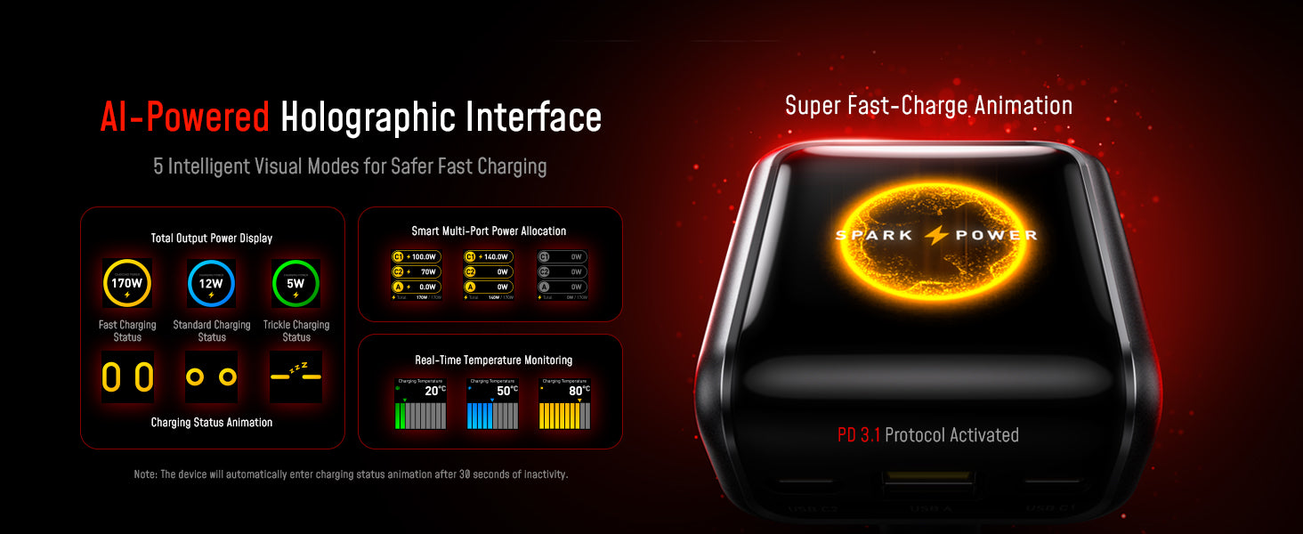 Powerful 170W Total Output: Charge three devices at once with two USB-C and one USB-A port, supported by smart power distribution that automatically allocates optimal power for maximum efficiency and stability. The upgraded AI Intelligent Diversion ensures seamless multi-port charging without interruptions, even with repeated re-plugging.